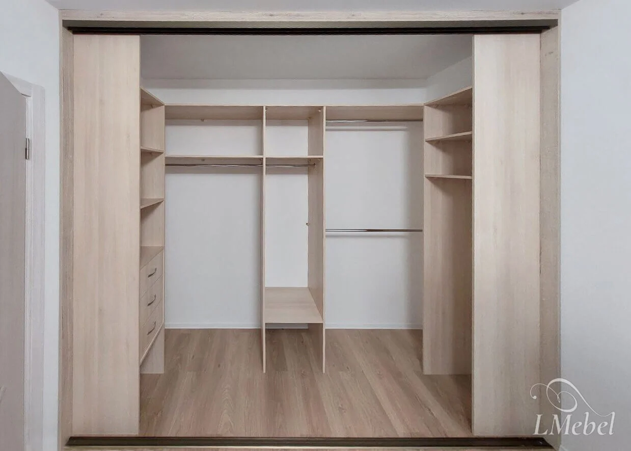 В конструкции предусмотрены вместительные полки под белье, выдвижные ящики с ручками и отделения со штангами для хранения одежды на тремпелях. Комбинированные двери-купе «под дерево» с простой и надежной системой направляющих дополнены зеркальными вставками на всю высоту.