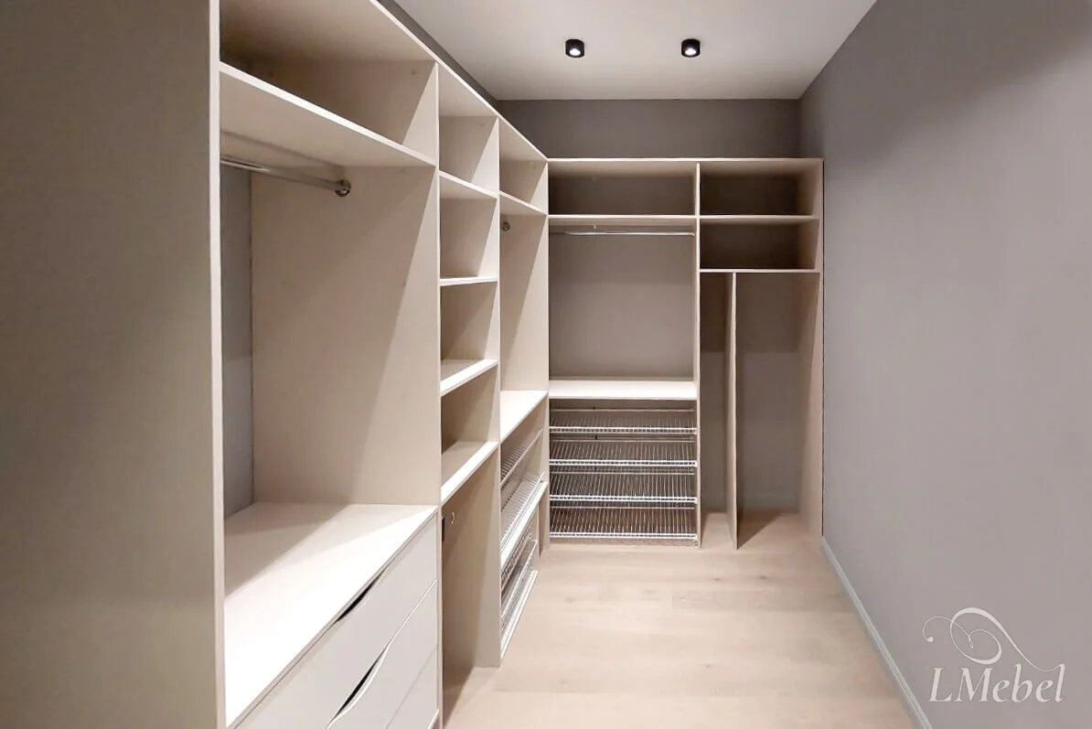 В наполнении гардеробной использованы удобные сетчатые корзины, перекладины для вещей на тремпелях. Продуманная система хранения позволит вместить всю одежду в одном месте. Для хранения нижнего белья, галстуков, носков и других аксессуаров предусмотрены выдвижные ящики с прорезями для удобного открывания. По желанию заказчика ящики можно оборудовать доводчиками для более плавного и бесшумного открывания. Гардеробная выполнена из высококачественного ЛДСП Egger, устойчивого к высокой влажности, перепадам температур и механическим повреждениям.
