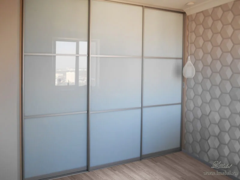Белые стеклянные двери для гардеробной комнаты или встроенного шкафа-купе. Стекло оклеено пленкой Oracal, которая имеет двойную функцию — тонирует поверхность и придает ей дополнительную прочность. Все три створки могут быть сдвинуты, как вправо, так и влево.