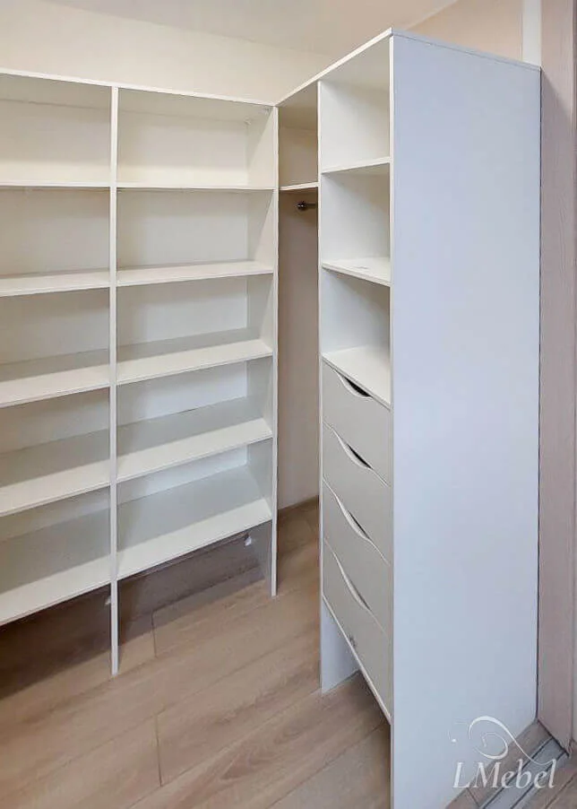 Светлая гардеробная комната позволит сэкономить полезное пространство, разместив в одном месте все нужные вещи. В наполнении использованы полки разной глубины, выдвижные ящики и отделения для мелких аксессуаров. Наполнение включает 6 секций с 22 полками различной глубины, что обеспечивает гибкость в размещении предметов разного размера. 3 штанги позволяют аккуратно вешать платья, костюмы и рубашки, избегая заломов и сохраняя идеальный внешний вид. 4 выдвижных ящика спроектированы для удобного хранения нижнего белья и других личных вещей.
