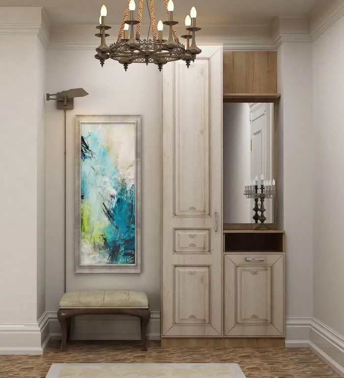 Маленькая светлая прихожая с оригинальным оформлением. При создании модели использованы мебельные плиты с необычной фактурой. Корпус изготовлен из ДСП оттенка «дуб галифакс», створки из ЛДСП, декорированных под светлый граб и украшенных рельефными узорами.