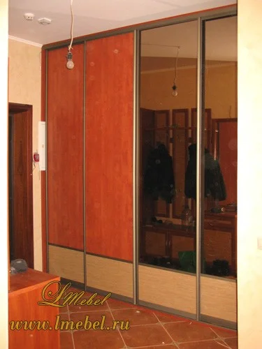Шкаф выполнен под потолок, в верхней части расположены антресоли, скрытые за общим фасадом. Для производства дверей были использованы три материала — зеркало, ДСП и бамбук.