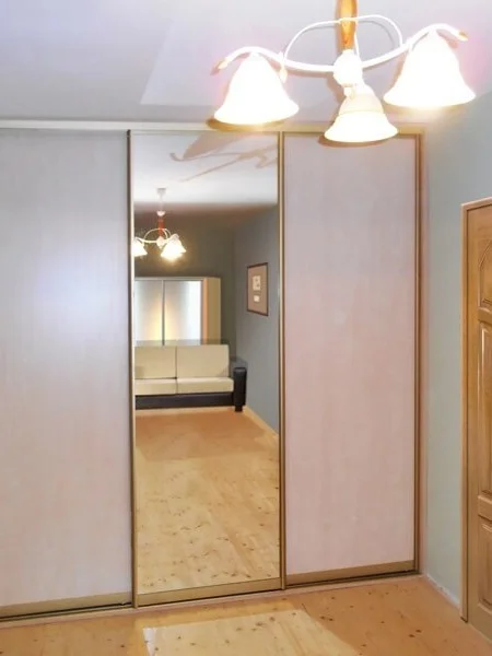 Трехстворчатый встроенный шкаф-купе в коридор. Боковые двери выполнены из ДСП цвета клена, центральная — из зеркального полотна. Наполнение — 3 штанги для одежды и 8 полок глубиной 60 см.