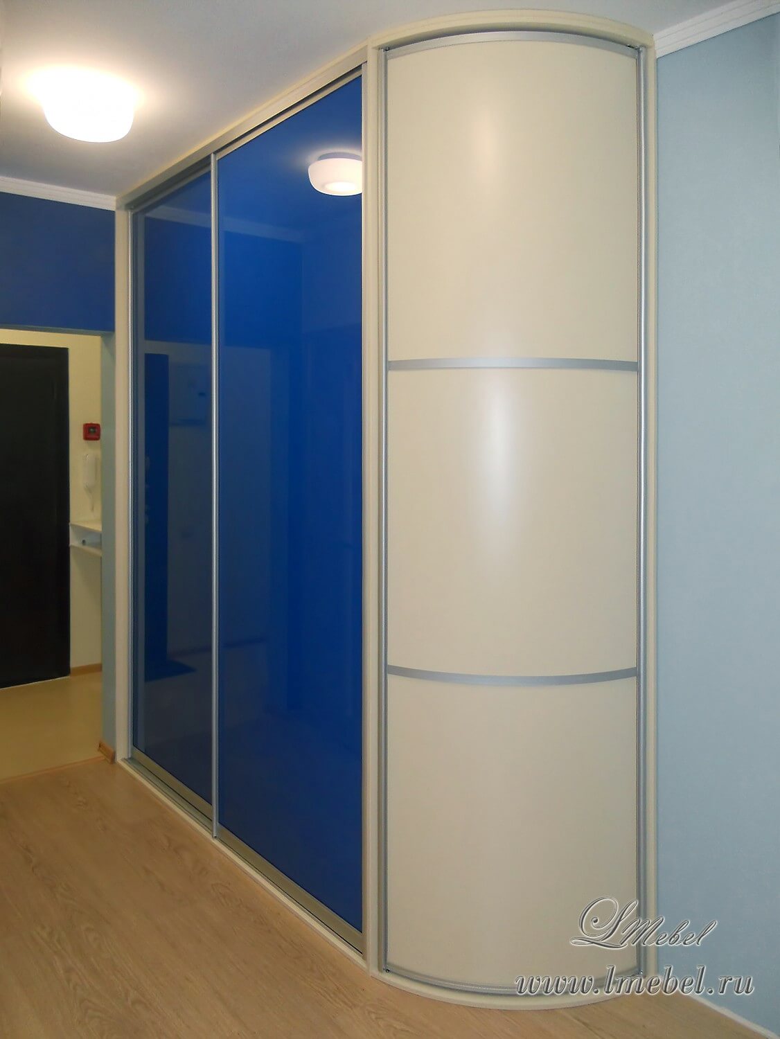 Большой встроенный шкаф-купе с радиусной боковой дверью. Такой шкаф станет ярким акцентом в прихожей, выполненной в современном стиле. Корпус шкафа выполнен из ДСП оттенка «ваниль», фасад и боковая распашная дверь — из стекла, оклеенного пленкой Oracal.