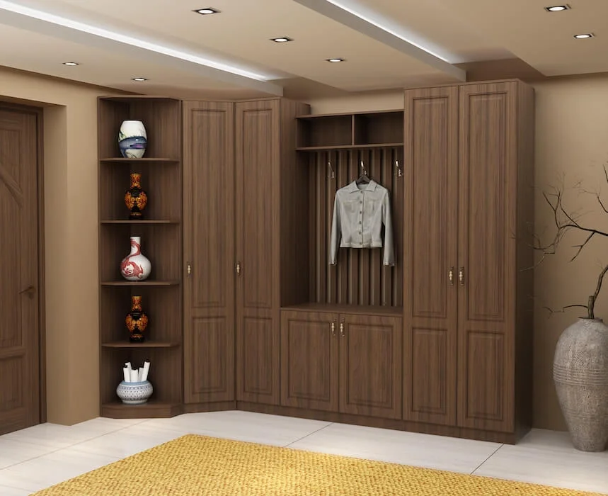 Темный угловой шкаф-купе для коридора или прихожей. Корпусная конструкция включает в себя две секции для вещей и открытые полки. Части шкафа можно поменять местами, а также дополнить их другими элементами хранения: комодом, витриной или обувницей.