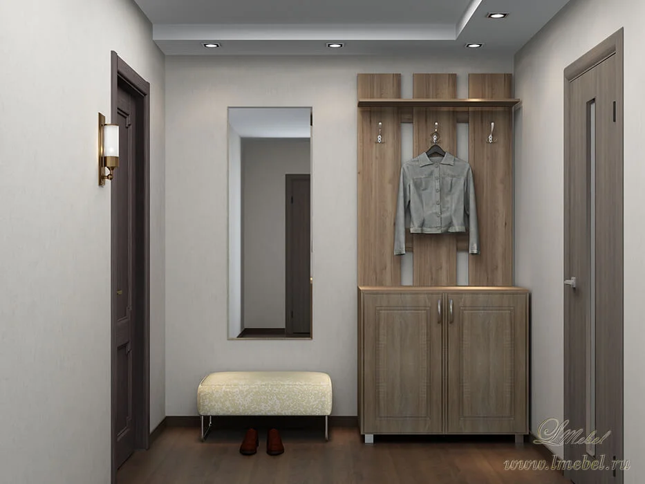 Открытая прихожая из ДСП и мебельных плит МДФ. В нижней части конструкции расположен ящик для обуви, вверху закреплена полочка для головных уборов. Конструкция отличается малым размером: глубина шкафа — 45 сантиметров, ширина — 1 метр.