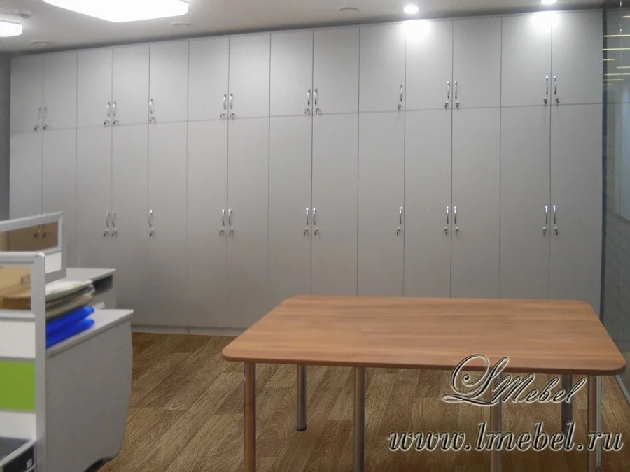 Большой распашной шкаф для офиса. Корпус и фасад изготовлены из ДСП цвета титана, в качестве наполнения использованы штанги для одежды. В верхней части расположены секции с полками. Дверцы шкафа закрываются на ключ.
