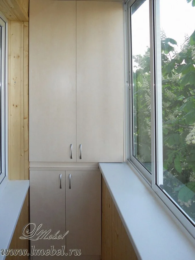 Маленький распашной шкаф для балкона. Шкаф разделен на две секции. В верхней установлена вешалка для одежды, в нижней — полочки глубиной 50 сантиметров. Корпус и фасад изготовлены из ДСП цвета березы.
