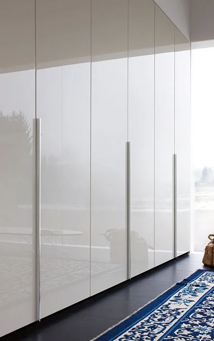 Высокий встроенный шкаф с глянцевыми фасадами. Двери изготовлены из мебельных плит МДФ белого цвета, для производства корпуса использованы ДСП оттенка «альпина белая». Внутри установлены штанги для одежды и полки глубиной 50 сантиметров.