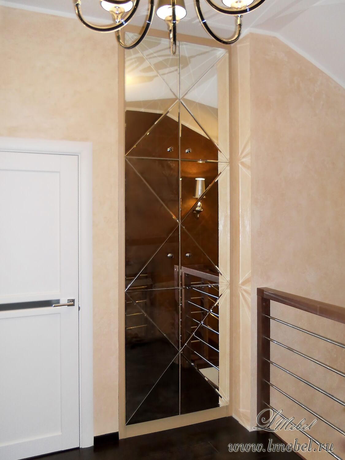 Небольшой встроенный зеркальный шкаф с распашными дверьми. Благодаря необычной раскладке зеркального полотна, шкаф выглядит как яркий предмет декора.