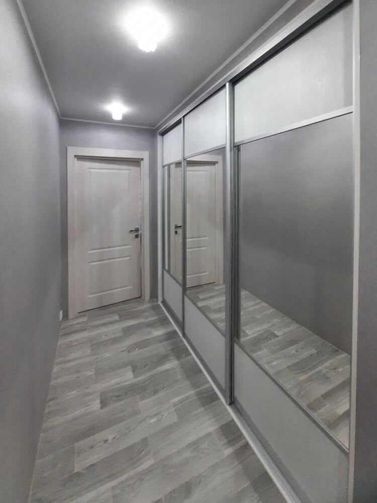 Двери-купе для встроенного шкафа. Назначение: для одежды. Три двери, цвет ДСП: cветло-серый и зеркало cеребро. Размеры: широкий. Наполнение: с зеркалом. Класс: эконом.