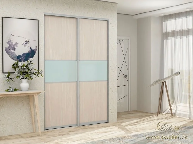 Предлагаем комбинированные двери для шкафов-купе с профилем Raumplus. Наполнение из ДСП со стеклянной вставкой. Ширина от 450 до 1200 мм. Высота до 2700 мм. В ассортименте 3 цвета профиля и 20 цветов ламинированного ДСП, можно выбрать любой из них по желанию. Такие двери подходят как для встроенных, так и для корпусных шкафов.