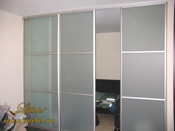 Светлые четырехстворчатые раздвижные двери для зонирования комнаты. Двери выполнены из стекла, оклеенного белой матовой пленкой. Она пропускает свет, но не позволяет разглядеть, что находится за дверью.
