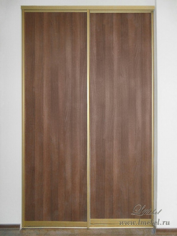 Раздвижные двери для зонирования пространства или гардеробной комнаты. Створки выполнены из ДСП с яркой древесной фактурой, для профиля был выбран алюминий цвета бронзы.