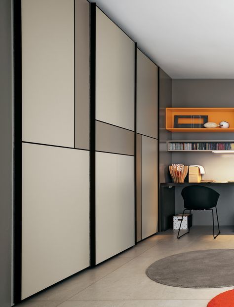 Широкие раздвижные двери для гардеробной комнаты или зонирования пространства. Двери выполнены в актуальной цветовой гамме, а необычная раскладка элементов придает конструкции оригинальный вид. Для наполнения створок использованы ламинированные ДСП. Смонтированы двери с помощью профиля SOFT-L.