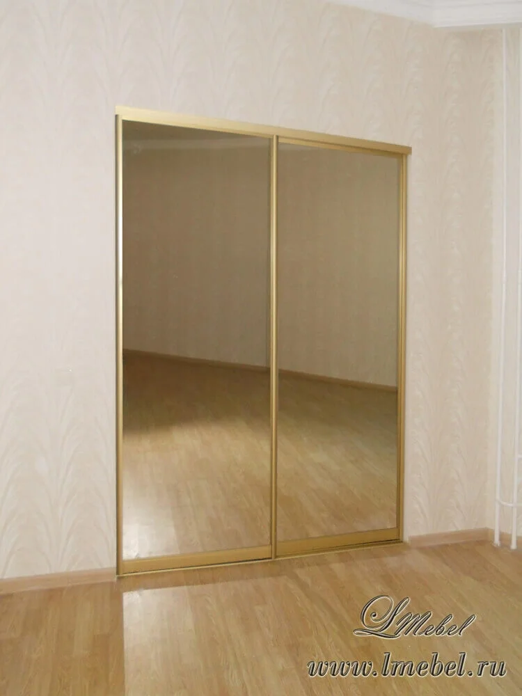 Широкие зеркальные двери-купе для гардеробной комнаты. Отсутствие видимых частей корпуса визуально превращает створки в большое зеркало, установленное у стены. Двери одинаково хорошо смотрятся в больших и маленьких помещениях, визуально увеличивают размер комнаты и добавляют света.