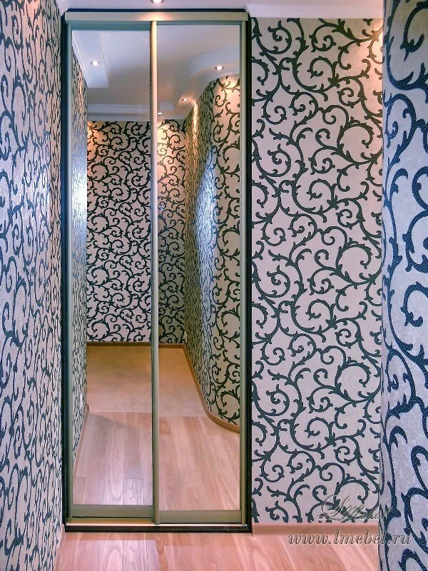 Узкие двери для встроенного шкафа купе с зеркальным наполнением. Небольшая ширина также позволяет использовать двери для обустройства в коридорах кладовок или гардеробных комнат.