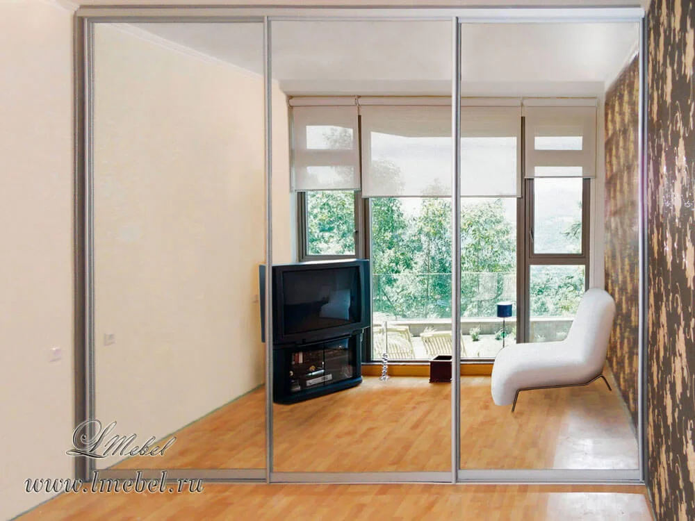 Большой зеркальный встроенный шкаф-купе с многофункциональным наполнением. В шкафу на разной высоте установлены 3 штанги для одежды, 6 выдвижных ящиков и 19 полок глубиной 60 сантиметров.