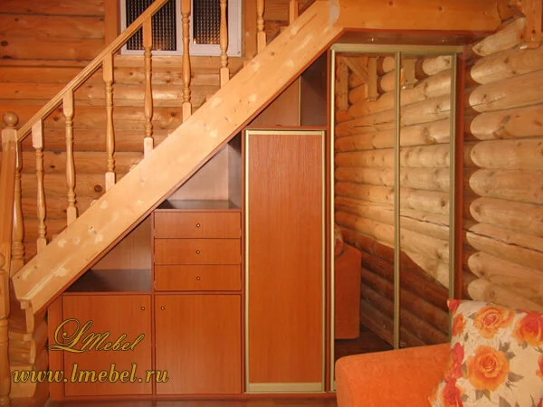 Зеркальный комбинированный шкаф под лестницу. Разнообразное функциональное наполнение в виде выдвижных ящиков, полок и штанг для одежды делает шкаф универсальным, и позволяет его использовать для хранения множества разных вещей.