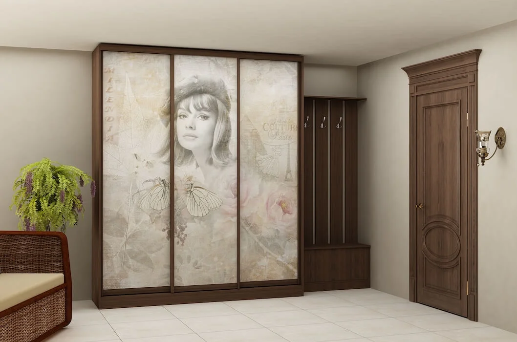 Шкаф-купе с фотопечатью для установки в прихожей или коридоре. Конструкция разделена на две секции — закрытую с полками и штангами и открытую, с вешалками, обувным комодом и небольшой полочкой, расположенной вверху. Корпус шкафа изготовлен из темных ДСП, двери из декорированного стекла. Дверное полотно закреплено с помощью тонированного алюминиевого профиля.