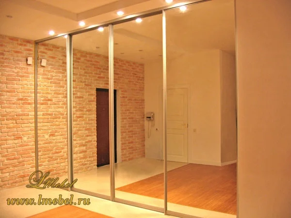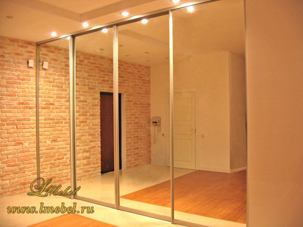 Большой зеркальный встроенный шкаф-купе с 4 дверьми. Фасад состоит алюминиевого профиля цвета матового серебра, створки — из серебристого зеркального полотна, которое отражает свет и визуально расширяет пространство комнаты.