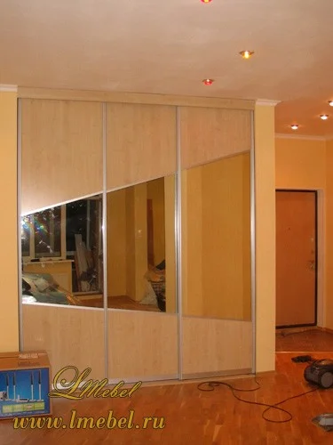 Светлые раздвижные двери для гардеробной комнаты. Двери выполнены из ДСП, имитирующего цвет и фактуру клена. В качестве декора использованы зеркала, расположенные по диагонали.