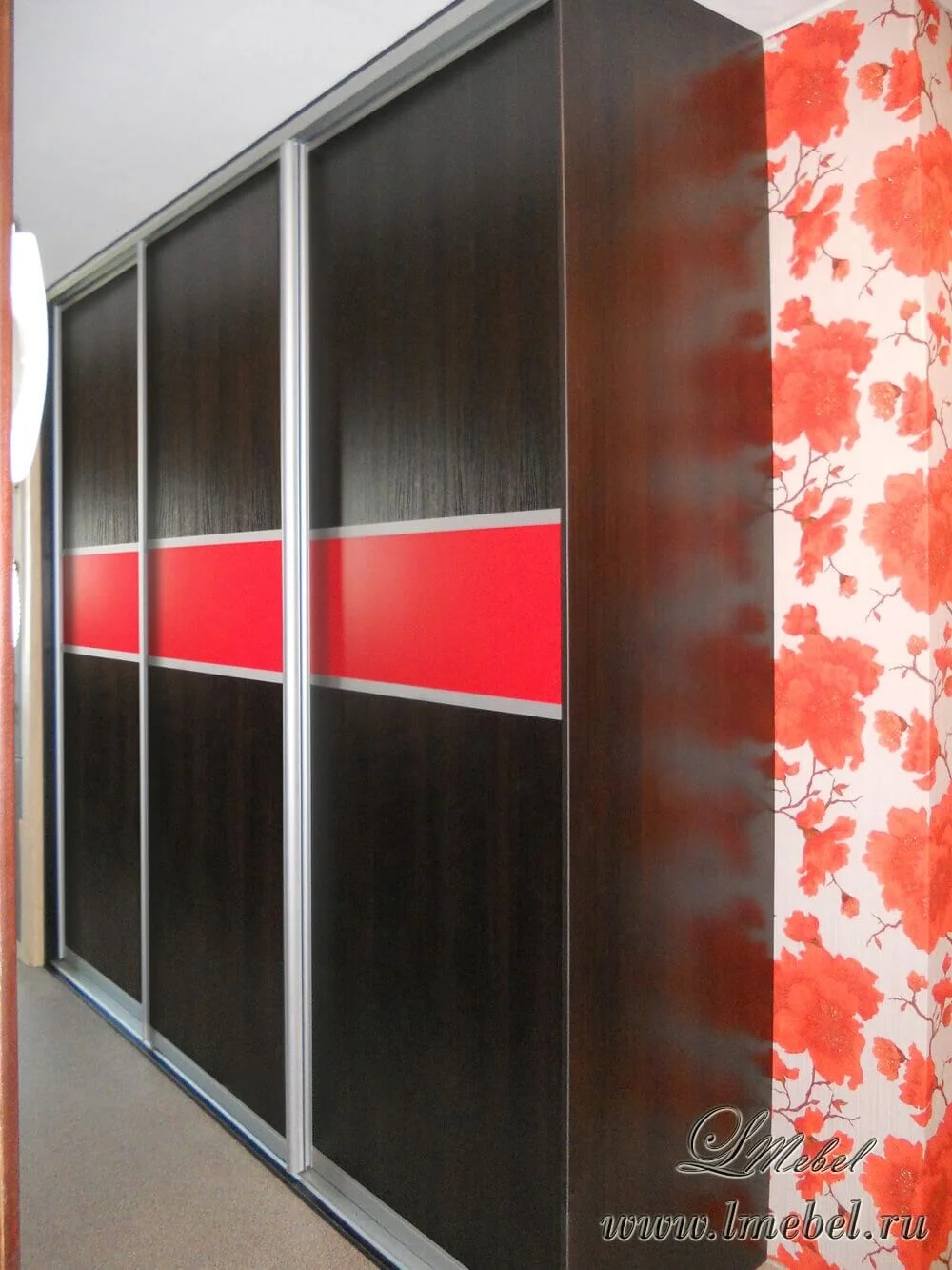 Темный трехдверный встроенный шкаф-купе с ярким декором. Профиль створок выполнен из тонированного под матовое серебро алюминия, яркие вставки — из алого ЛДСП. В качестве наполнения использованы полки глубиной 60 см и штанги.