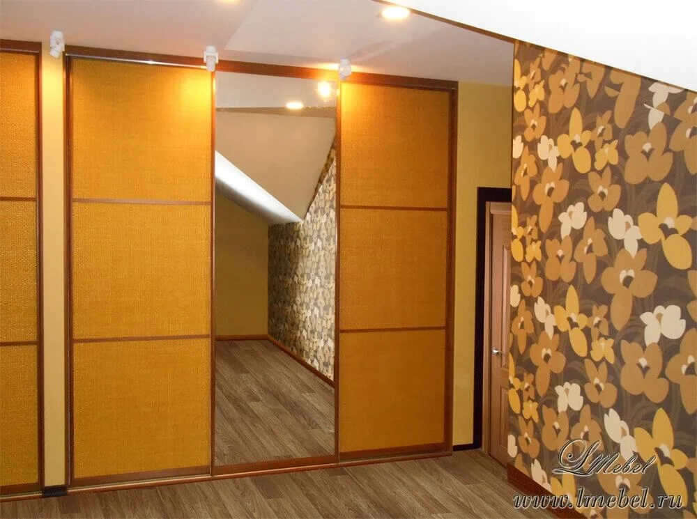 Трехдверный встроенный шкаф-купе с многофункциональным наполнением. В шкафу установлены 3 штанги для одежды, 4 ящика и 12 полочек. Фасад шкафа декорирован зеркалом и натуральным раттаном.