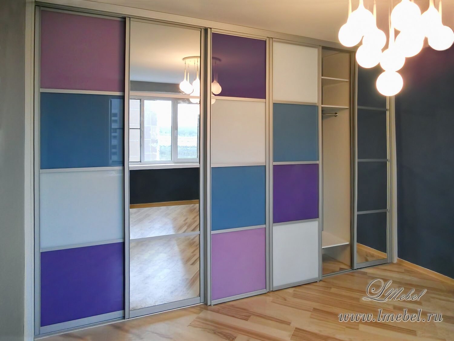 Большой встроенный шкаф-купе оригинальной конструкции с ярким фасадом. Шкаф установлен у стены с дверным проемом, а одна из его створок является межкомнатной дверью. Для того чтобы не создавать препятствие на входе, двери установлены на подвесной конструкции.