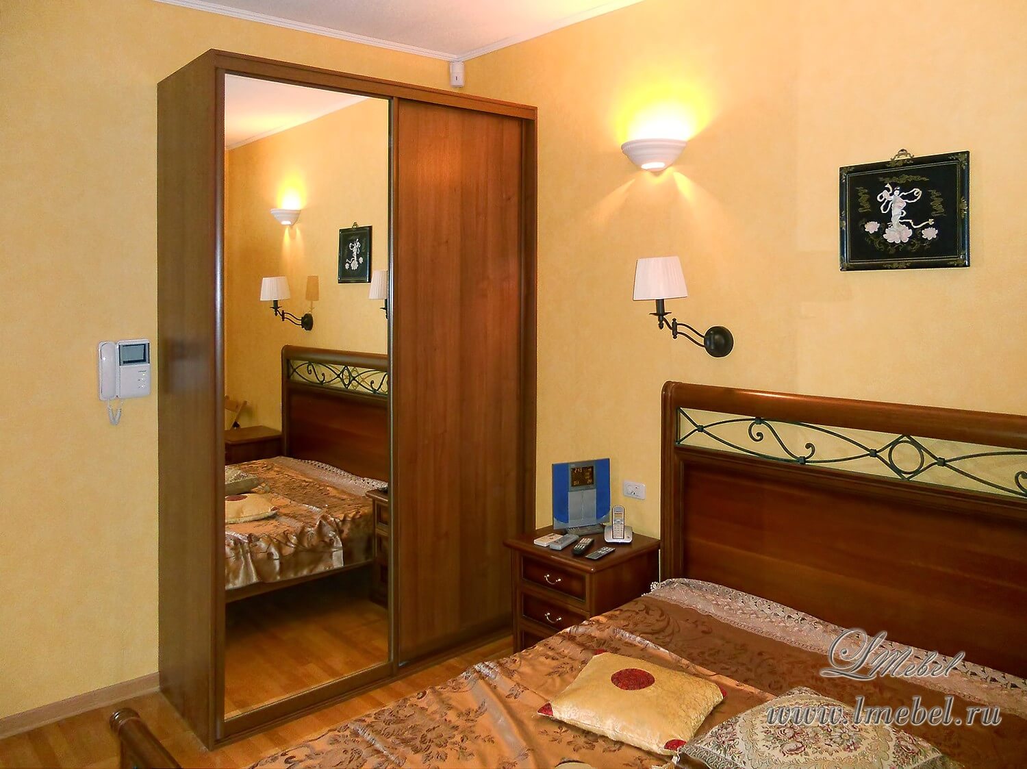 Зеркальный встроенный шкаф-купе с полками и штангой для одежды. Корпус шкафа и одна из створок выполнены из ДСП оттенка темного ореха, алюминиевый профиль тонирован под бронзу. Благодаря широким дверям, найти нужную вещь в шкафу будет очень просто.