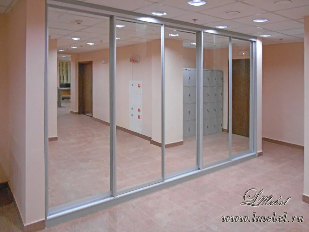 Зеркальный встроенный шкаф-купе для офиса. В шкафу установлены пять продольных штанг, которые позволят разместить на плечиках одежду, как сотрудников, так и гостей офиса.